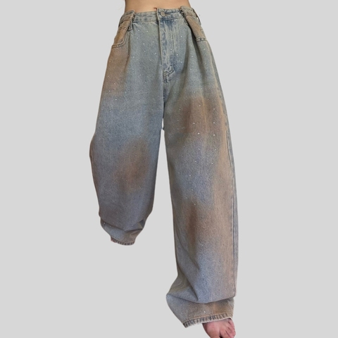 Hippe Pop Dames Laagbouw Hart Patroon Baggy Jeans Gewassen Wijde Pijpen Denim Cargo Holejogging Broek